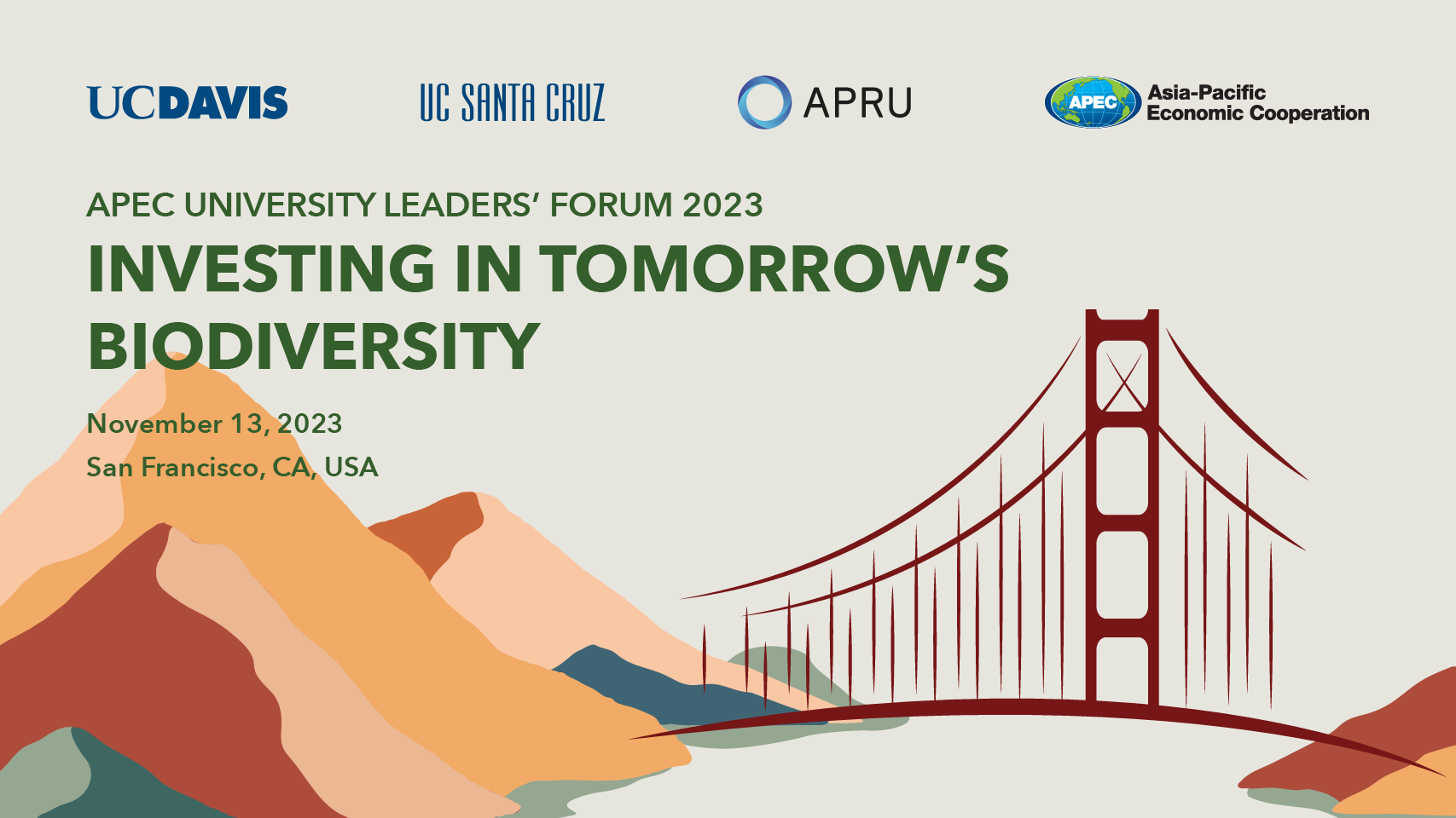 Co-sponsored by the University of California, Davis, the University of California, Santa Cruz, and the Association of Pacific Rim Universities, the event will take place from 8 a.m. to 5 p.m. at San Francisco's Commonwealth Club on the sidelines of the annual APEC CEO Summit. The Forum will be a catalyst for leading universities of APEC to exchange cutting-edge research innovations and explore collaborative initiatives that will shape strategic investment of biodiversity.