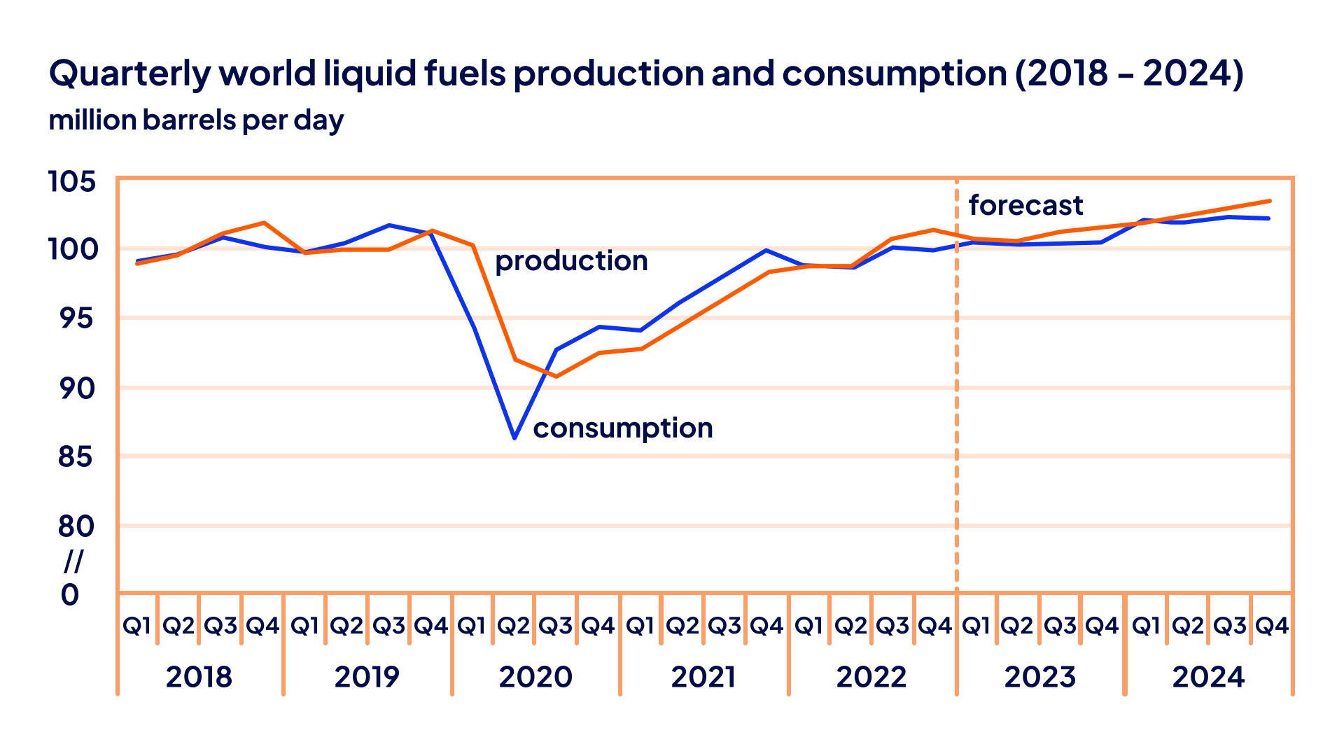- OPEC+ has taken key strategic steps to minimise supply while maximising the price. U.S. preferences are increasingly shifting toward renewable energy, while Russian oil is subject to restraining sanctions. The implication is that falling global oil production will contribute to higher prices over the next few years. Thus, the International Energy Association (EIA) forecasts production growth of 1% in 2023, which with the average assumed growth of global GDP of 1.8%, creates these prerequisites (see fig.).